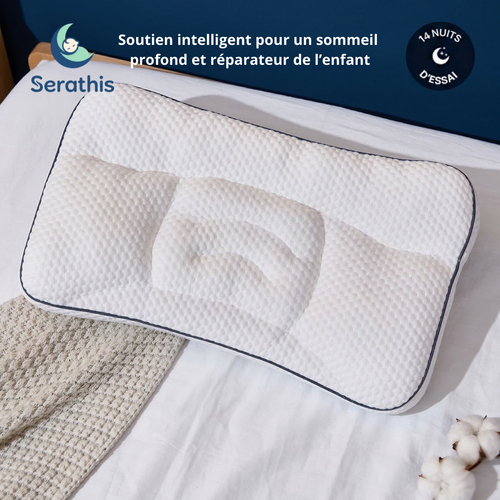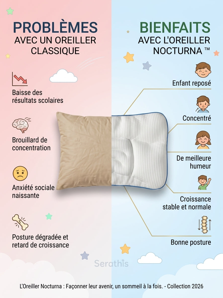 Entre 1 et 16 ans, la colonne vertébrale est en pleine construction. Un oreiller trop mou ou trop haut crée des tensions invisibles qui perturbent le sommeil profond (là où l'enfant grandit). Serathis aligne naturellement les cervicales avec le reste du dos. Offrir Nocturna, ce n’est pas acheter un coussin, c’est offrir un socle sain à sa croissance.